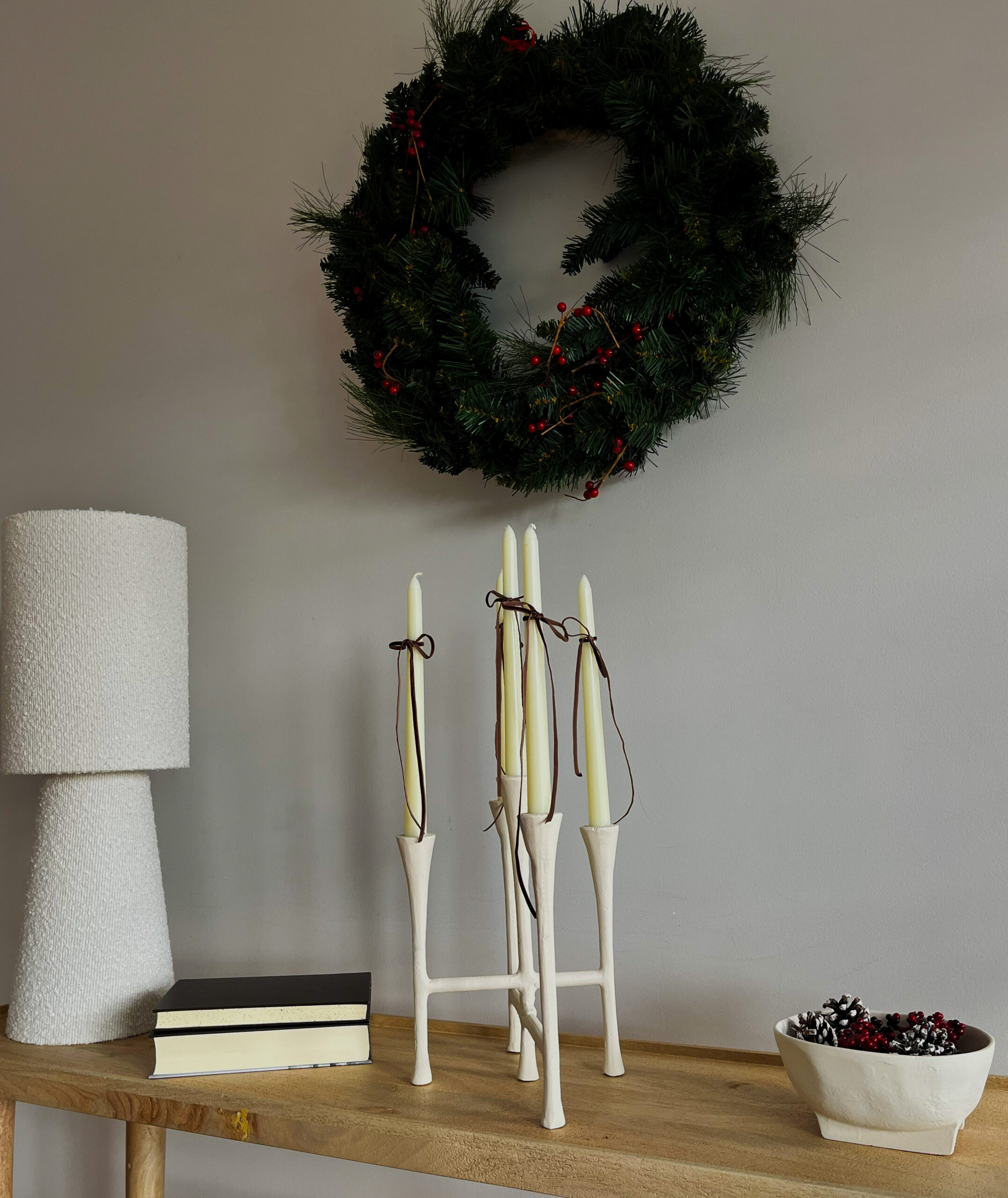 Δεν χρειάζεσαι πολλά για να φέρεις τα Χριστούγεννα πιο κοντά. Μερικά απλά αντικείμενα — ένα κερί, ένα κηροπήγιο, ένα βάζο με κλαδιά — αρκούν για να δημιουργήσουν μια ήρεμη, γιορτινή σκηνή.