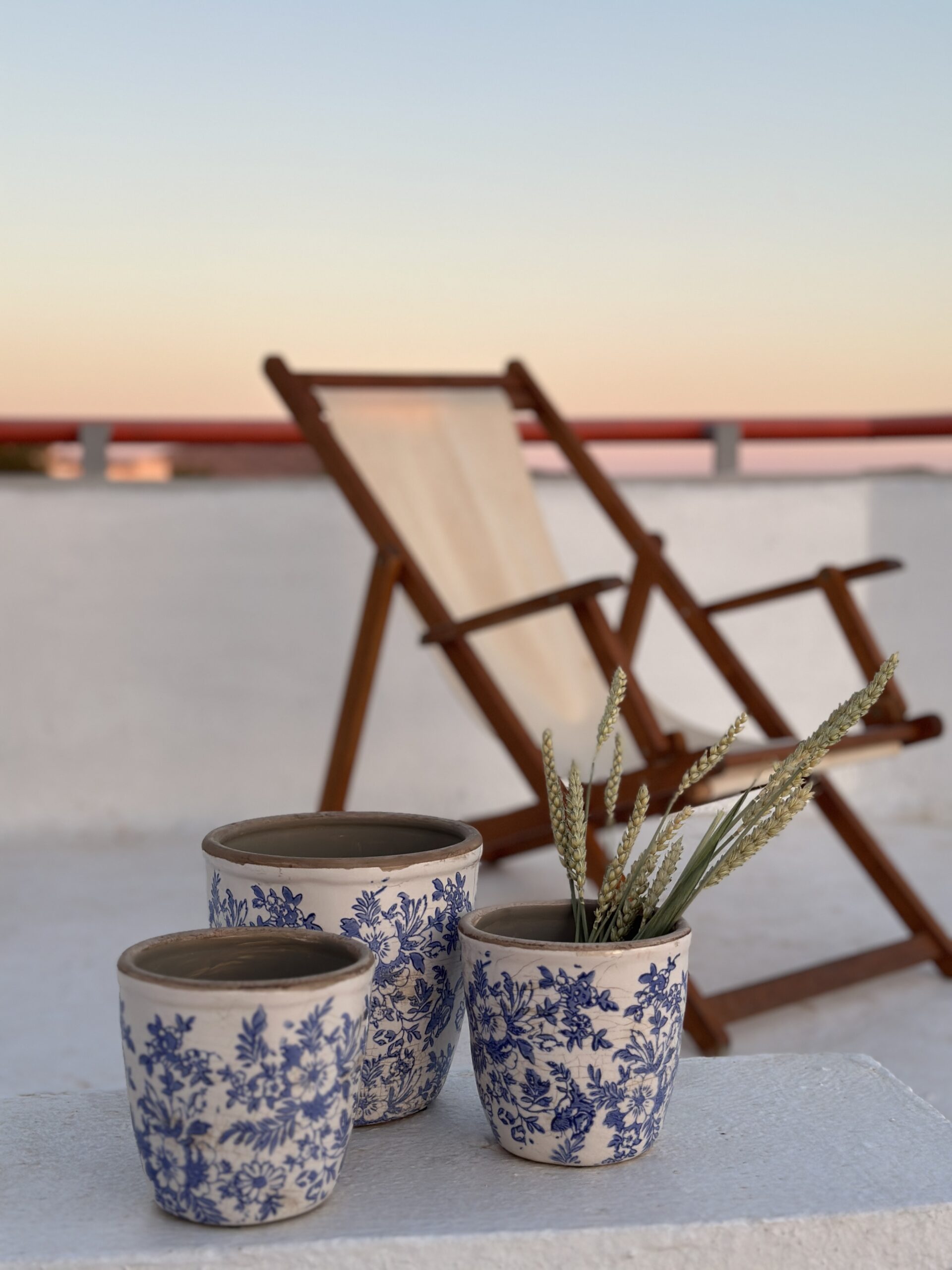 Κεραμικό κασπώ σε λευκές και μπλέ αποχρώσεις με σχέδιο. Διαθέσιμο σε 2 διαστάσεις: 16×15 12×12 εκ. Το σχέδιο των λουλουδιών στο εξωτερικό μέρος του κασπώ δίνουν μια αίσθηση γαλλικής εξοχής προσφέροντας ζωντάνια στον χώρο. Ιδανικό για εσωτερικούς και εξωτερικούς χώρους.